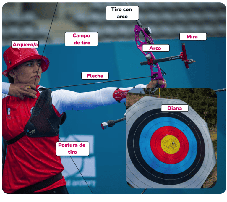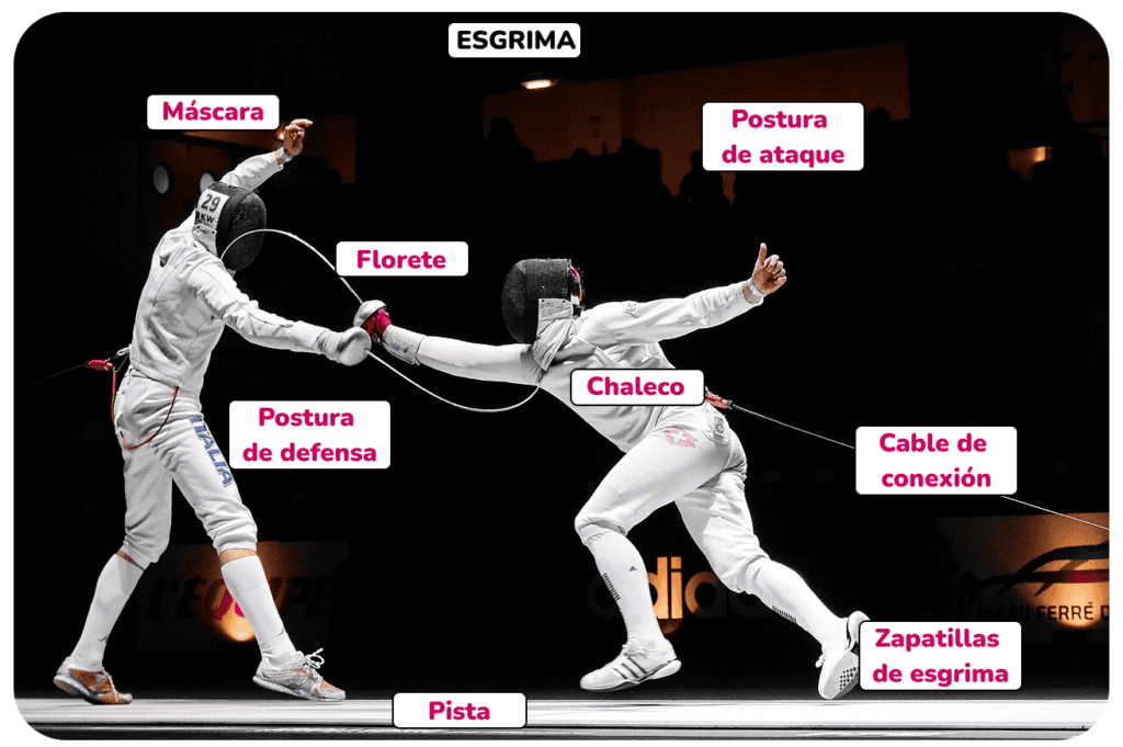 - Each image has labels pointing to specific equipment, actions, or parts of the sport.