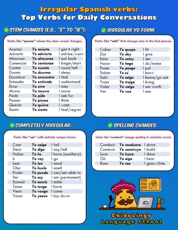 Download this handy image that lays out all the irregular verb conjugations we’ve discussed. It’s perfect for a quick study aid or even as a nifty wallpaper for your desktop. Keep it close for a quick Spanish verb conjugation refresher!